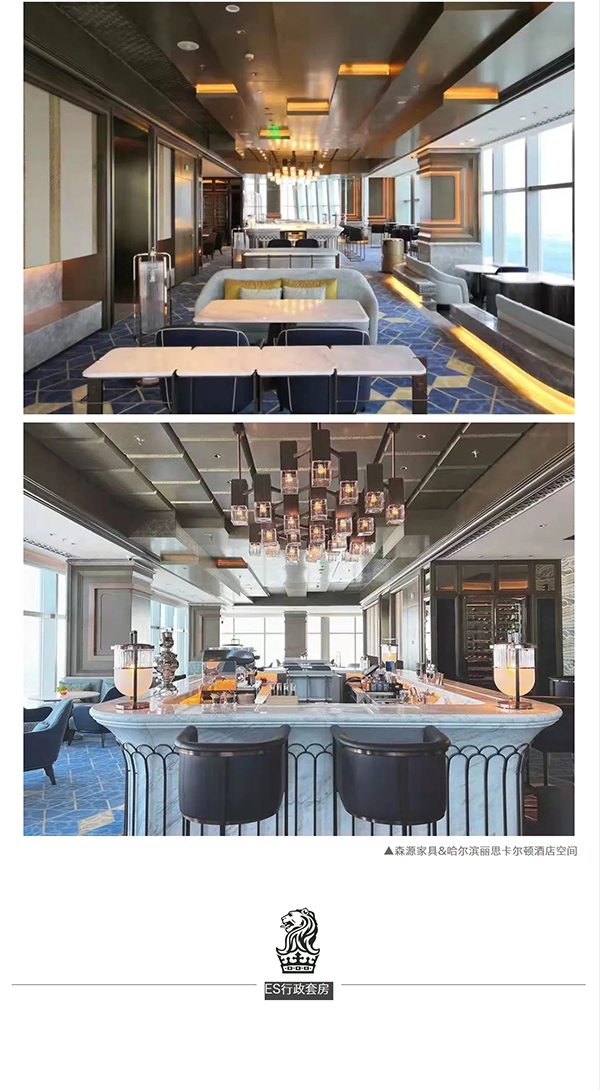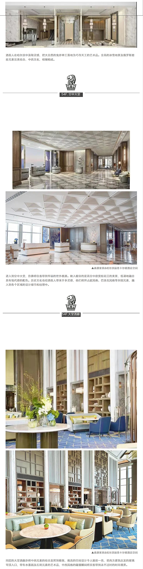 十分感謝富力集團(tuán)&哈爾濱麗思卡爾頓酒店,森源家具有幸承接了酒店核心版塊:首三層所有公共區(qū)域包含到達(dá)大堂、所有ES行政套房、五十三層行政酒廊、五十四層空中大堂和空中酒廊區(qū)、三十七層泳池及健身房區(qū)等**定制家具。