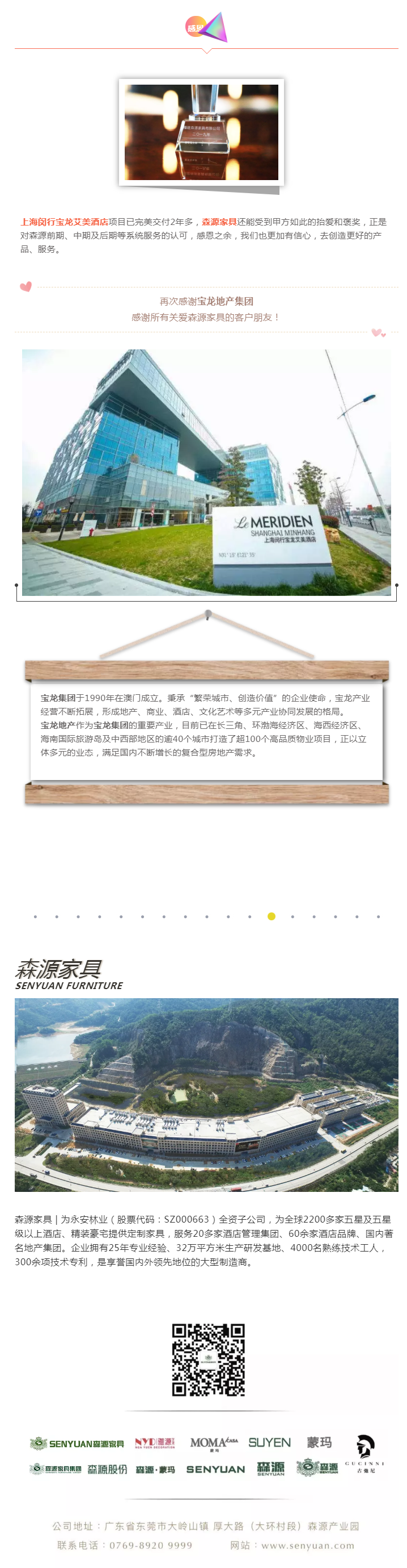 森源家具緣起上海閔行寶龍艾美酒店的精品品質(zhì)與服務(wù),從寶龍集團(tuán)近1200家戰(zhàn)略供應(yīng)商庫(kù)中評(píng)出,